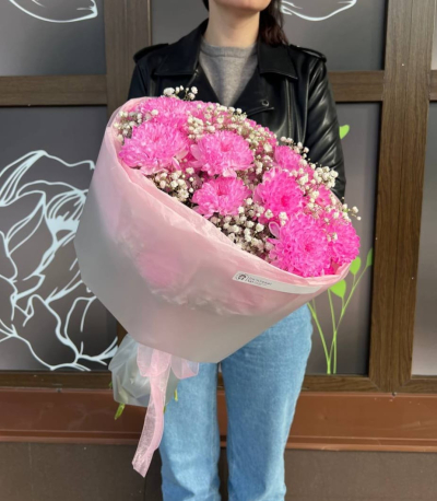 Хризантема кустовая цветная, гипсофила белая, тишью, упаковка матовая, лента